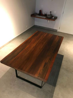 Mesa de jantar em madeira de demolição e pés em aço preto.