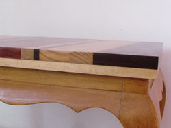 Mesa lateral com tampo em marchetaria e base reaproveitada de um móvel antigo.